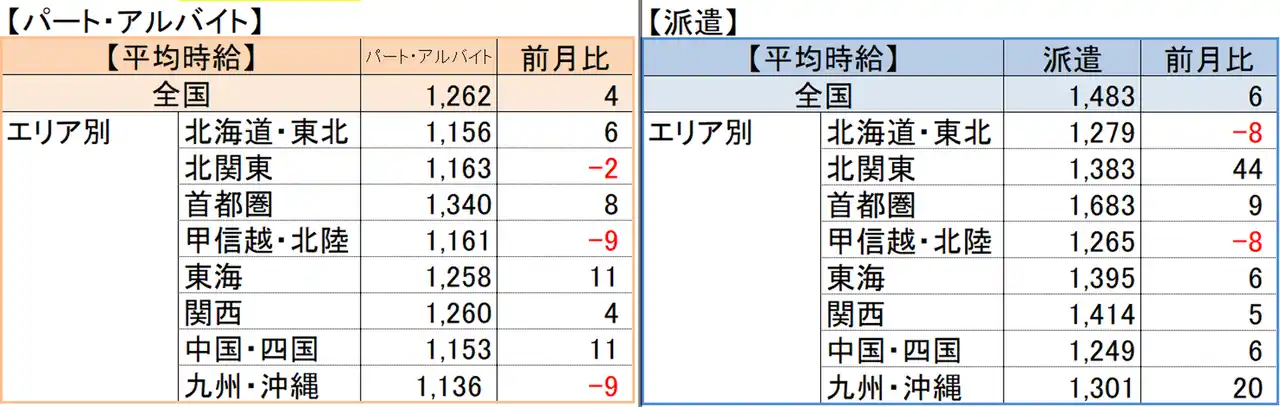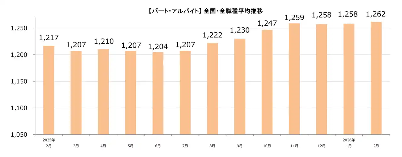 【パート・アルバイト】全国・全職種平均時給は1,262円。前月比+4円。前年同月比+45円。 |