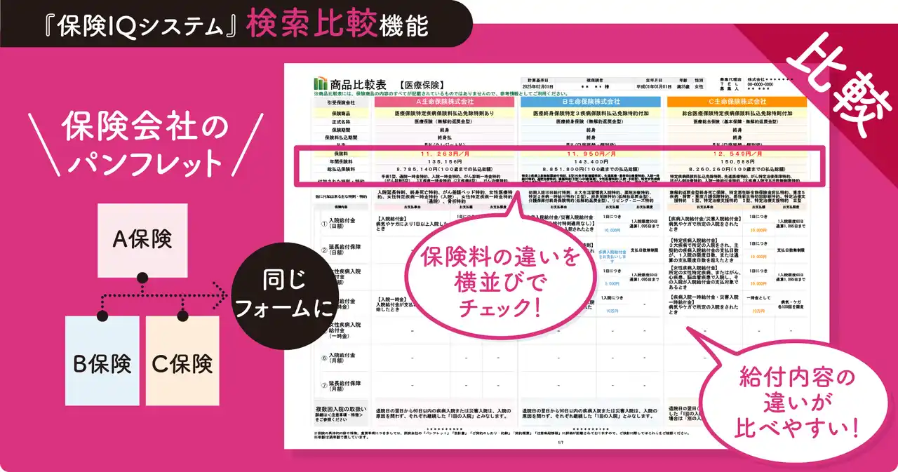 新しく保険の加入や見直しを考えている方向けの機能です。お客様のご希望をもとに保険商品を検索し、その中からさらにお客様のご希望に沿った複数の保険商品を同じフォーマットで並べた比較表をお出しします。別々の保険会社・保険商品で並べたり、同じ保険商品の中でも保障額や特約を変更して並べることもできます。ご希望に沿わない場合は条件を変更して何度でもお出し致しますので、ご納得できるまで比較頂けます。 |