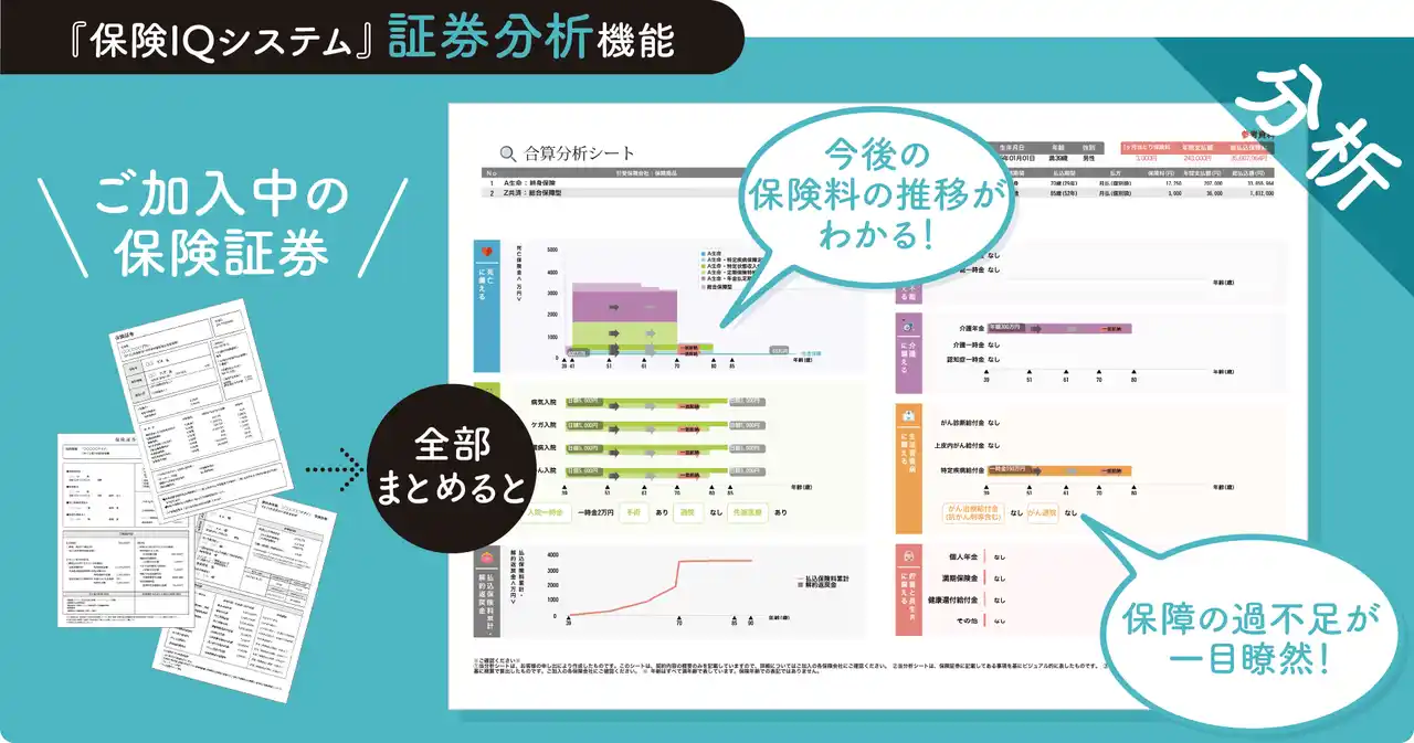 現在保険に加入されている方向けの機能です。保障内容をビジュアル化したもので、「いつまで」「いくら」保障されているのかがグラフになります。また、複数の保険にご加入されている場合はそれらを合算して表示することができるので、保障内容が一目でわかるようになります。出来上がった証券分析シートはコンサルタントがていねいに説明いたしますので、加入されている保険がご自身に合っているかを確認いただけます。 |