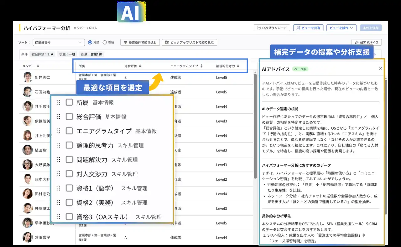 株式会社カオナビ(本社:東京都渋谷区、代表取締役社長CEO:佐藤 寛之)が提供するタレントマネジメントシステム「カオナビ」は、人材データベースの情報を目的に合わせて抽出・一覧表示できる「セレクトビュー」において、ハイパフォーマー分析などのテーマに応じて、AIが分析に最適なデータ項目を選定する機能を、2026年3月19日(木)より提供します。 |