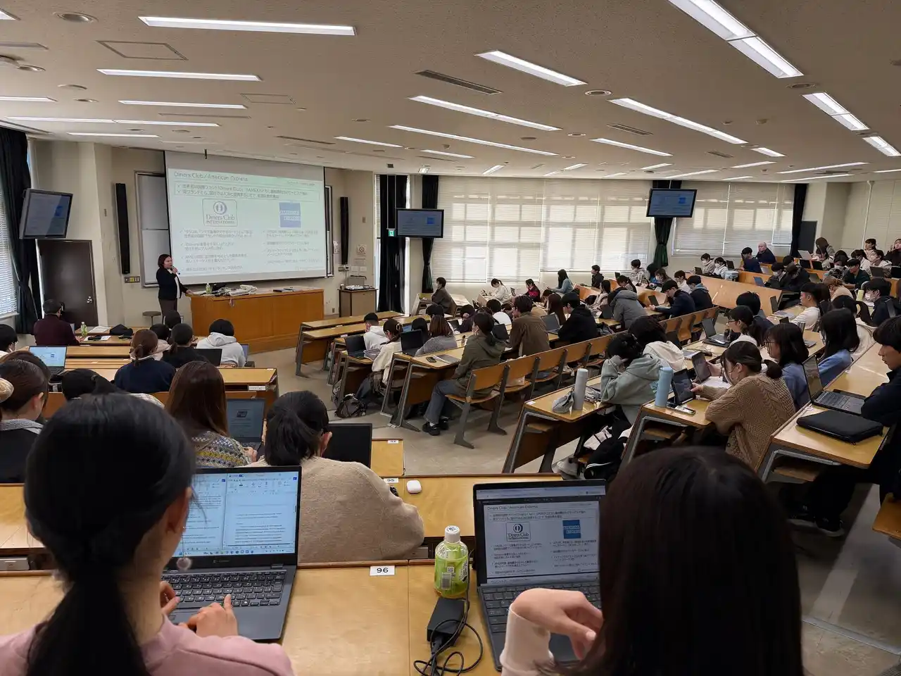 当日は、歴代のダイナースクラブカードやメタルカード(金属製)のサンプルを教室に展示し、学生の皆様にご覧いただきました。中でもメタルカード(金属製)への興味・関心は高く、多くの学生が手に取って重厚感や高級感を確かめながら、驚きの声を上げていました。 |