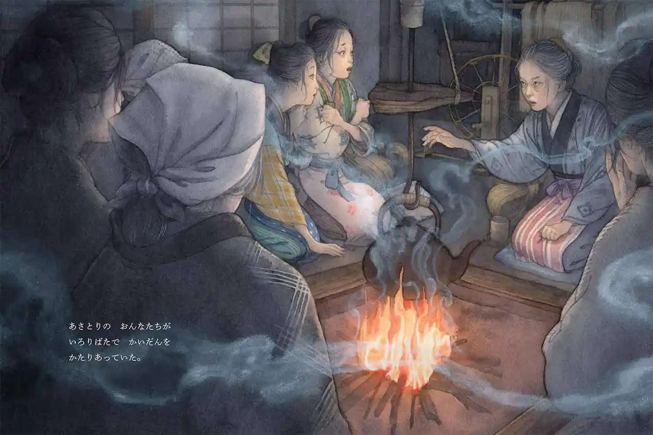| 寒い夜、怪談話に興じていた麻取りの女たち。 | |||||||||||||||||||