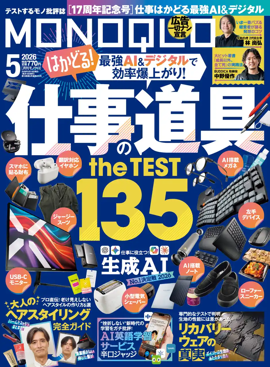 5月号は「はかどる! 仕事の道具 the TEST135」を総力特集! 最強AI&デジタルで効率も成果も爆上がりさせるアイテムを厳選して紹介します。スゴ腕ビジネスマン、林 尚弘氏&中野 優作氏の2大インタビューも見逃せない! その他、挫折しがちな方必見の「AI英語学習サービス辛口ジャッジ」や「大人のヘアスタイリング完全ガイド」なども掲載。5月号も暮らしをアップデートする情報を厳選してお届けします。 |