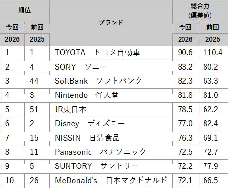 ビジネス・パーソン編の「総合力」ランキングでは、トヨタ自動車が19度目の首位(前回首位)、ソニーが第2位(同第4位)、ソフトバンクが第3位(同第44位)となった。続いて、任天堂が第4位(同第3位)、JR東日本が第5位(同第51位)を獲得した。また、ソフトバンク、JR東日本、日清食品、パナソニック、日本マクドナルドの5ブランドが、新たにトップ10入りした。 |