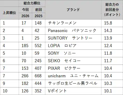 「総合力」上昇ランキング上位をみると、チキンラーメンが15.8pt上昇し首位となった。湖池屋とコラボした「0秒チキンラーメン」の展開や、モスバーガーとの協同企画で話題を集めた活動などが「アウトスタンディング」指標で高く評価された。ロピアは12.4 pt上昇した。大容量で高品質な精肉や惣菜や独自の売り場づくりで「エンターテインメント性のある節約」ができる店として「イノベーティブ」指標、「アウトスタンディング」指標で高く評価された。 |