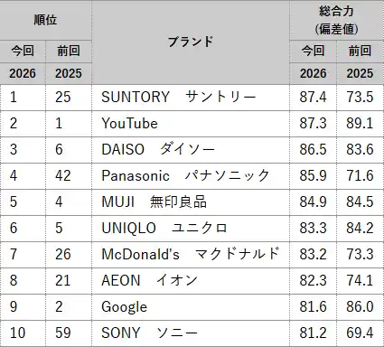 YouTube、ダイソー、パナソニック、無印良品がトップ5入り |