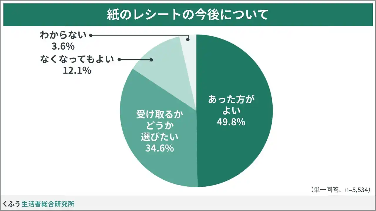 一方、「なくなってもよい」(12.1%)は約1割にとどまりました。電子レシートへの変更を求める声もありましたが、紙のレシートでの受け取りと混在するのであれば逆に手間が増えるため、一概に賛成できないという人が多いようです。 |