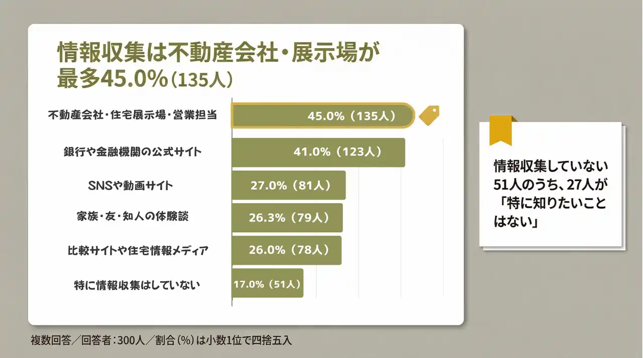 ・不動産会社・住宅展示場・営業担当 45.0%(135人) ・銀行や金融機関の公式サイト 41.0%(123人) ・SNSや動画サイト 27.0%(81人) ・家族・友人・知人の体験談 26.3%(79人) ・比較サイトや住宅情報メディア 26.0%(78人) ・特に情報収集はしていない 17.0%(51人) |