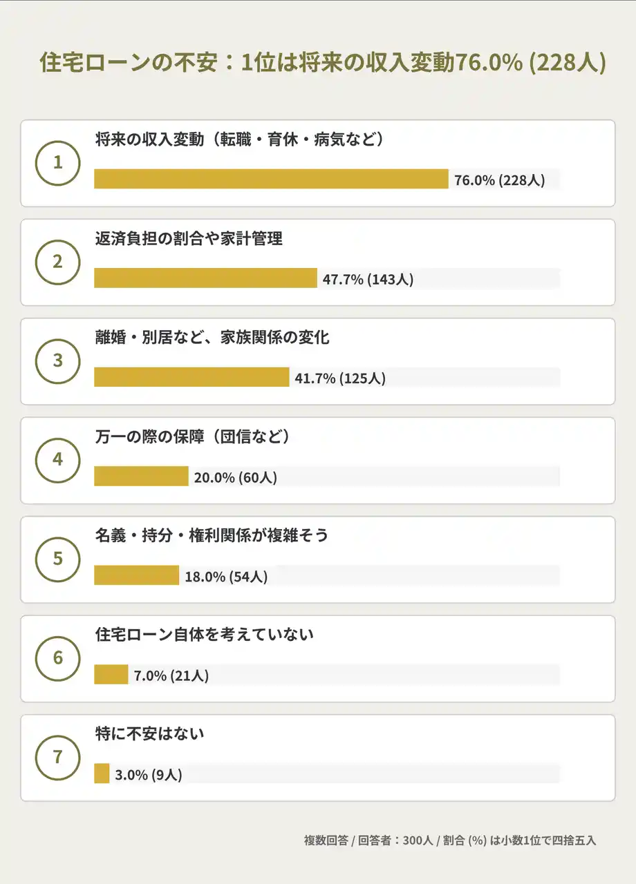 | 本調査では、住宅ローンに関する不安として将来の収入変動が76.0%(228人)で最も多く、返済負担や家計管理、離婚・別居など家族関係の変化といった、生活基盤に直結する要素が上位に挙がりました。住宅ローンの不安は、金銭面だけでなく、将来のライフイベントや家庭環境の変化と強く結びついていることが分かります。 | ||||||||||||||||||||||||||||||