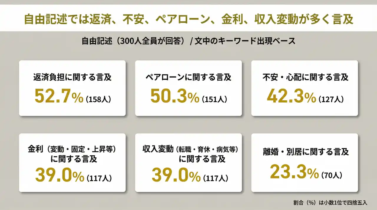 | 自由記述から浮かび上がるのは、住宅ローンをめぐる複合的な不安です。返済負担、将来の不確実性、ペアローンのリスク、金利変動――これらが複雑に絡み合い、決断を難しくしています。 | ||||||||||||||||||||||||||||||
