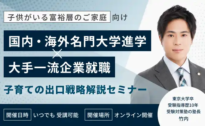 | 「富裕層なら知っておきたい!勉強嫌いな子どもでも国内/海外の名門大学を目指せる受験戦略~一流企業への就職戦略付き~」 | |||