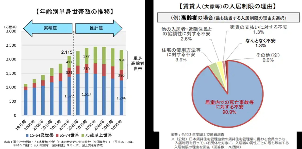 現在、日本の単身高齢者世帯は年々増加しており、2030年には800万世帯を超えると予測されています(※1)。一方で、管理会社やオーナーにとっては、孤独死に伴う物件価値の低下や原状回復費用の発生、さらには安否確認等の管理業務負担が、高齢者の受け入れ判断における大きなハードルとなっています。実際に、約6割の大家が高齢者の入居に対して拒否感を持っているという調査結果(※2)もあり、2025年秋に施行された改正住宅セーフティネット法への対応も含め、実効性のある居住支援策が求められています。 |
