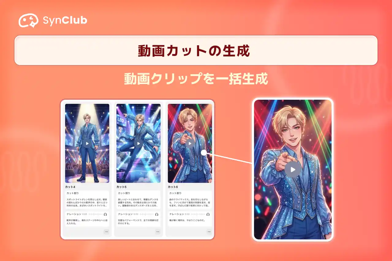 HiClub株式会社(本社:東京都港区、代表取締役社長:古谷由宇)が提供する、AIチャット&友達作りができる対話型AIアプリ「SynClub(シンクラブ)」は、Web版の新機能としてアニメショート動画生成機能「アニショート」をリリースいたします。 |