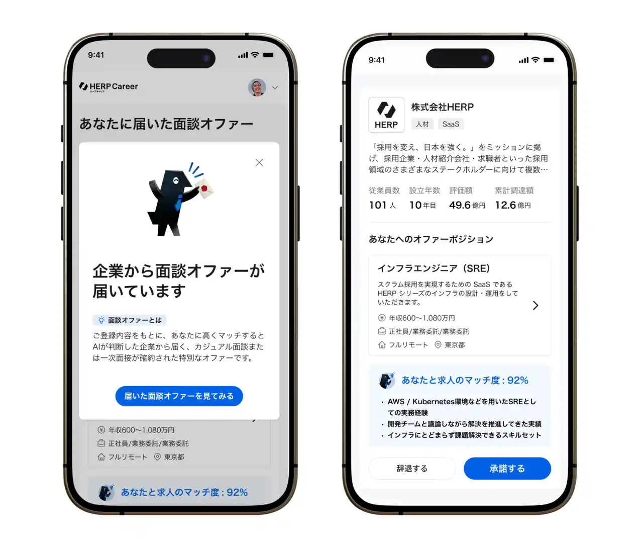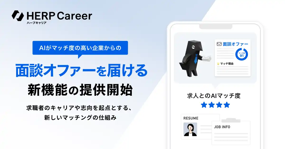 株式会社HERP(本社:東京都品川区、代表取締役:庄田一郎)は、求人メディア『HERP Career』(ハープキャリア)において、AIがマッチ度の高い企業からの面談オファーを届ける新機能を提供開始しました。採用管理システム『HERP Hire』の採用実績統計データを活用し、マッチング可能性の高い企業からのオファーを届けるため、求職者は厳選された「本当に合う企業」とだけ面談することができます。 |