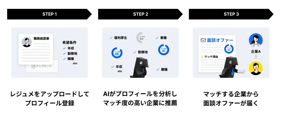AIが求職者に合った企業をピックアップし、企業はAIに推薦された求職者に対してのみオファーを送るため、求職者のキャリアや志向にマッチしたスカウトだけが届きます。 |