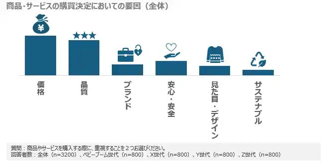 消費支出の配分を決める要因としては、「価格」と「品質」が上位を占めており、依然として合理的・機能的価値が重視されている。 |