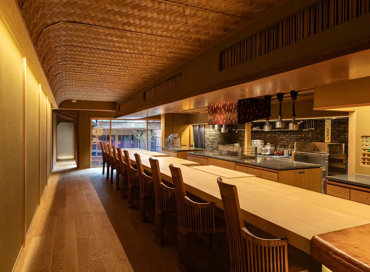 2002年、同エリアに移転の後、2006年、八坂通に100坪の一軒家を購入、同年10月に現店舗を開店。全17席のカウンターは、昼夜共に全席一斉スタート。 |