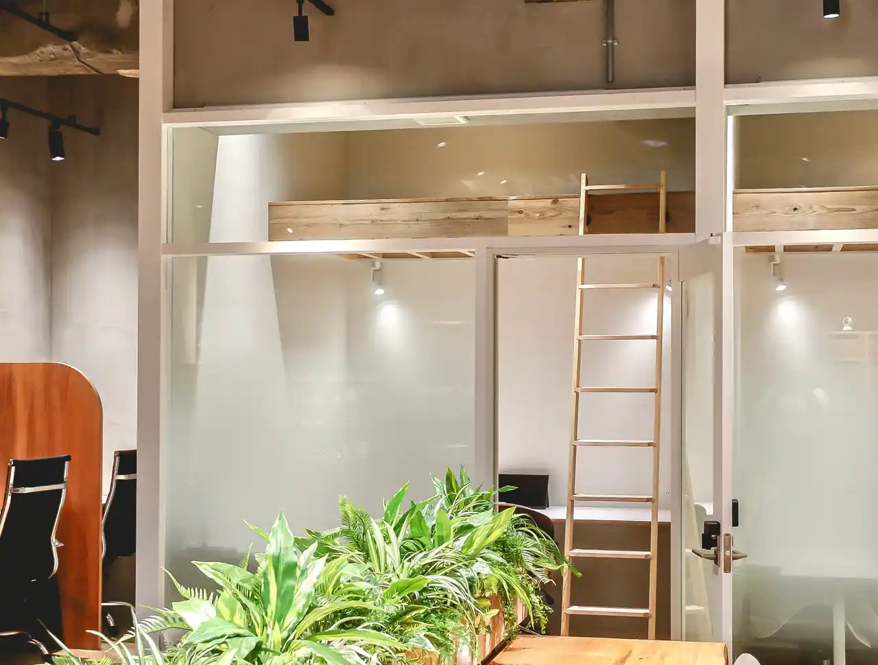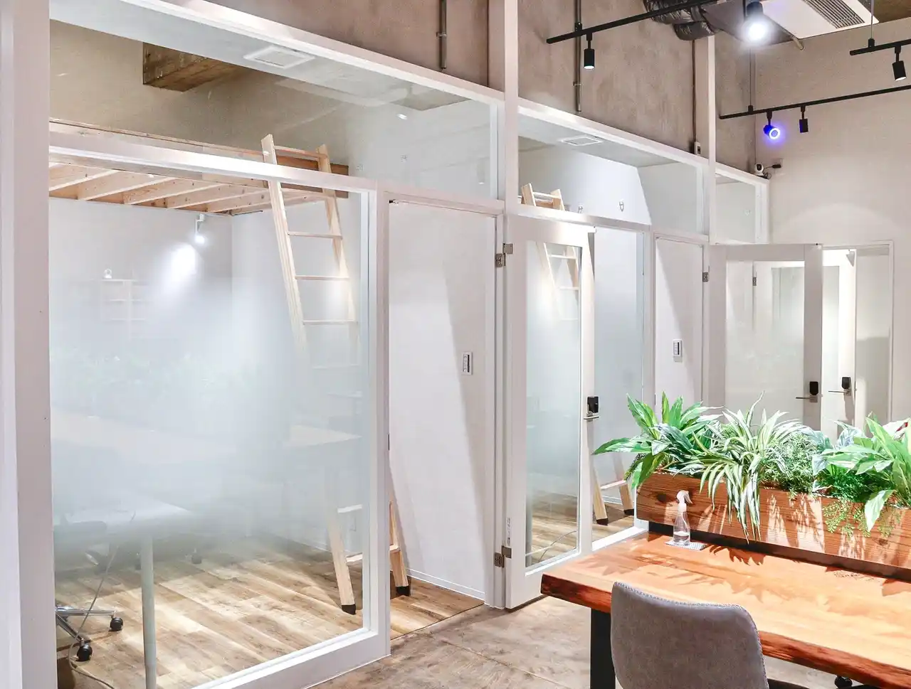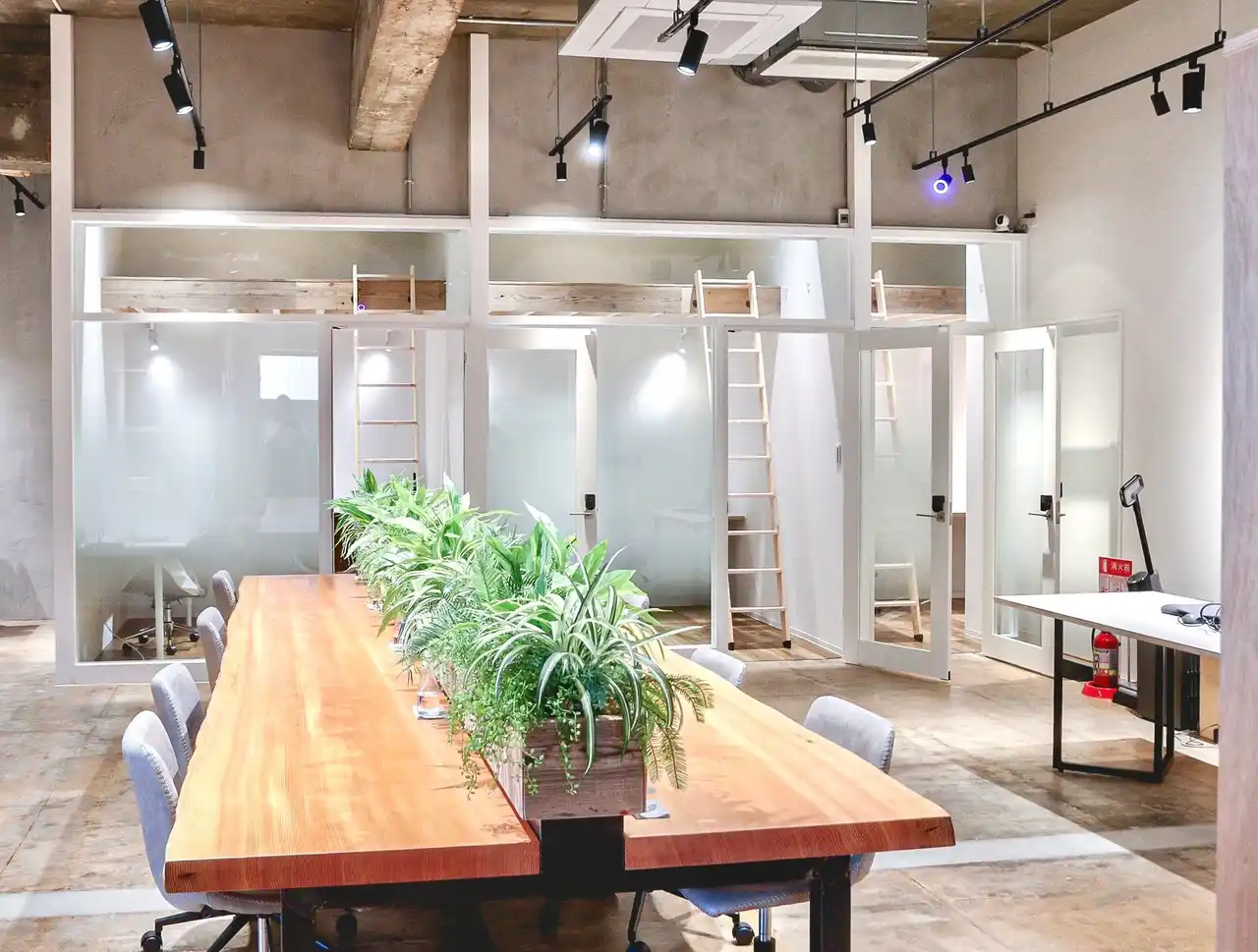 全ての個室に、約3畳分の広大なロフトを完備。2Kマンションの一部屋を「荷物置き」にしていた非効率を解消。ロフト付きという空間が、執務エリアでの集中力を生み出します。 |