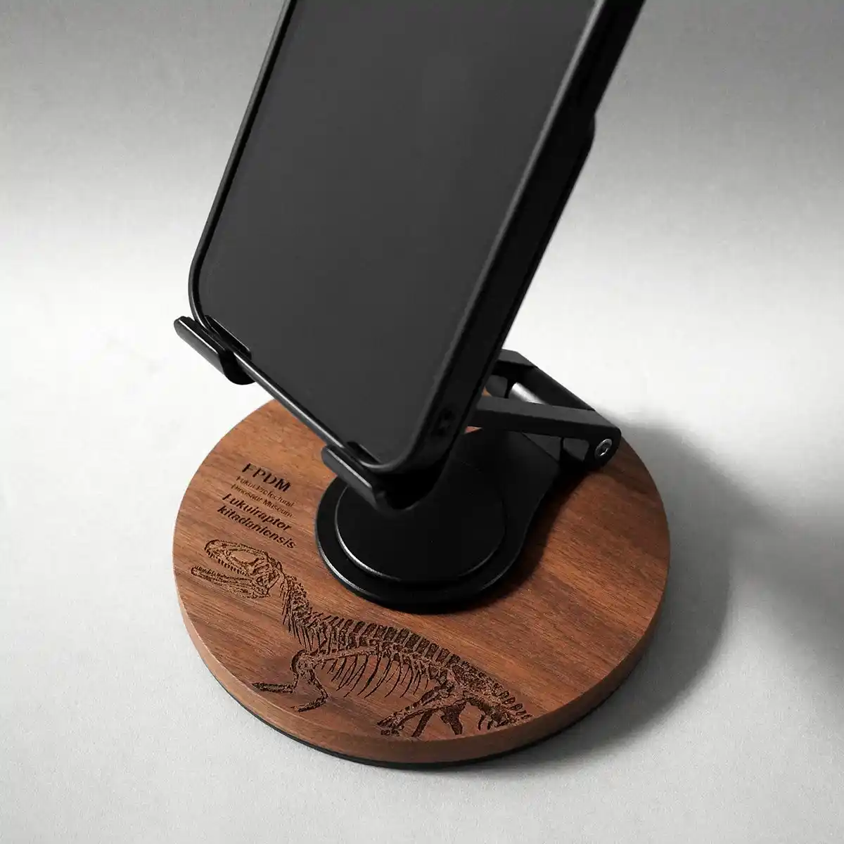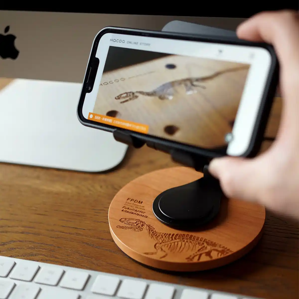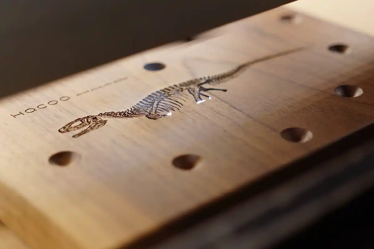 遠目には銘木のテクスチャが魅力で、近くで見ると緻密な恐竜デザインが現れます。この絶妙なバランスが「大人の遊び心」を体現します。 |