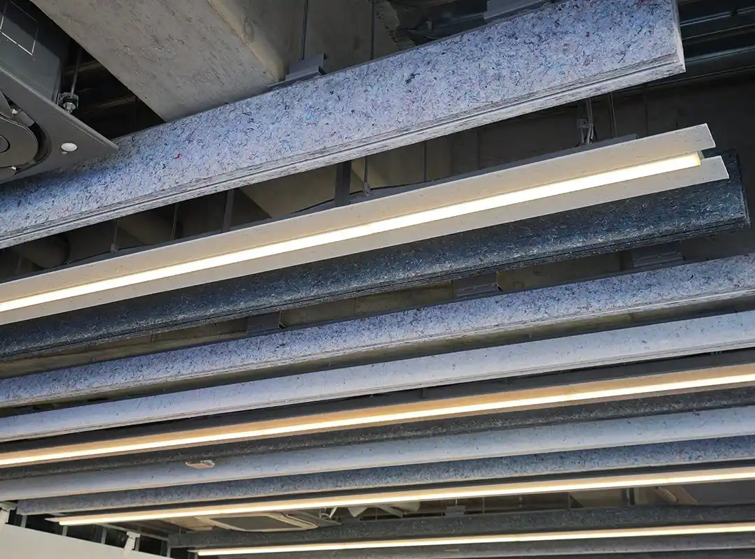 多様な人々が集まり、活発なワークショップや議論が行われるこの場所では、反響音を抑え、集中と対話を両立させる快適な音響設計が求められました。 今回採用された「Rebornfiber(R) Q-on」は、不用な古繊維を一度繊維状に戻して成形したリサイクル素材の吸音材です。 |