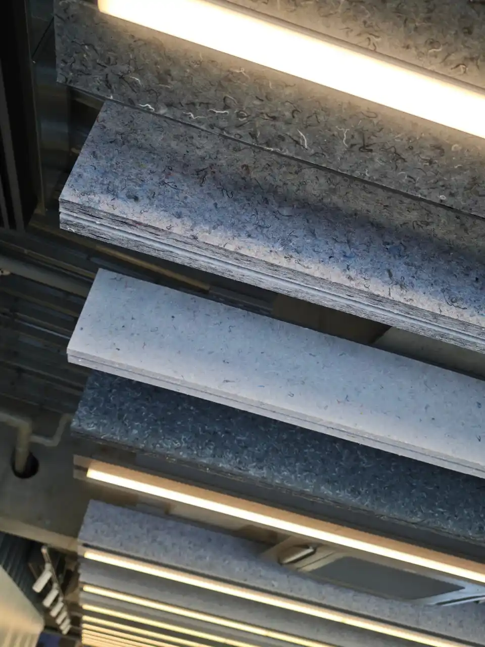 1か所目はスケルトンの天井にルーバーとして、そしてもう1か所はパーティションのような壁面の裏側で木枠にはめ込むようなかたちです。いずれの活用法も、Rebornfiber(R)にとっては初の試みであります。 |