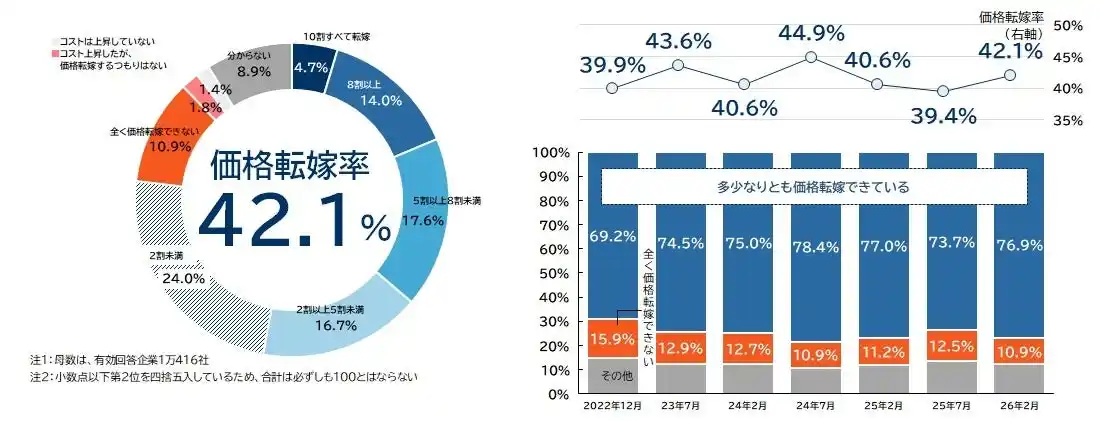 2月調査時点で、企業がコスト上昇を販売価格にどの程度上乗せできたかを示す価格転嫁率は42.1%となった。4割台を回復したものの、依然として転嫁が進まない企業が少なくない。川下産業や価格決定権の弱い業種、小規模企業ほど負担が重く、交渉上の立場の弱さも顕著だった。コスト上昇分を企業単独で価格転嫁することには限界が感じられ、取引慣行の見直しや交渉支援、消費者理解の促進が不可欠となっている。 |