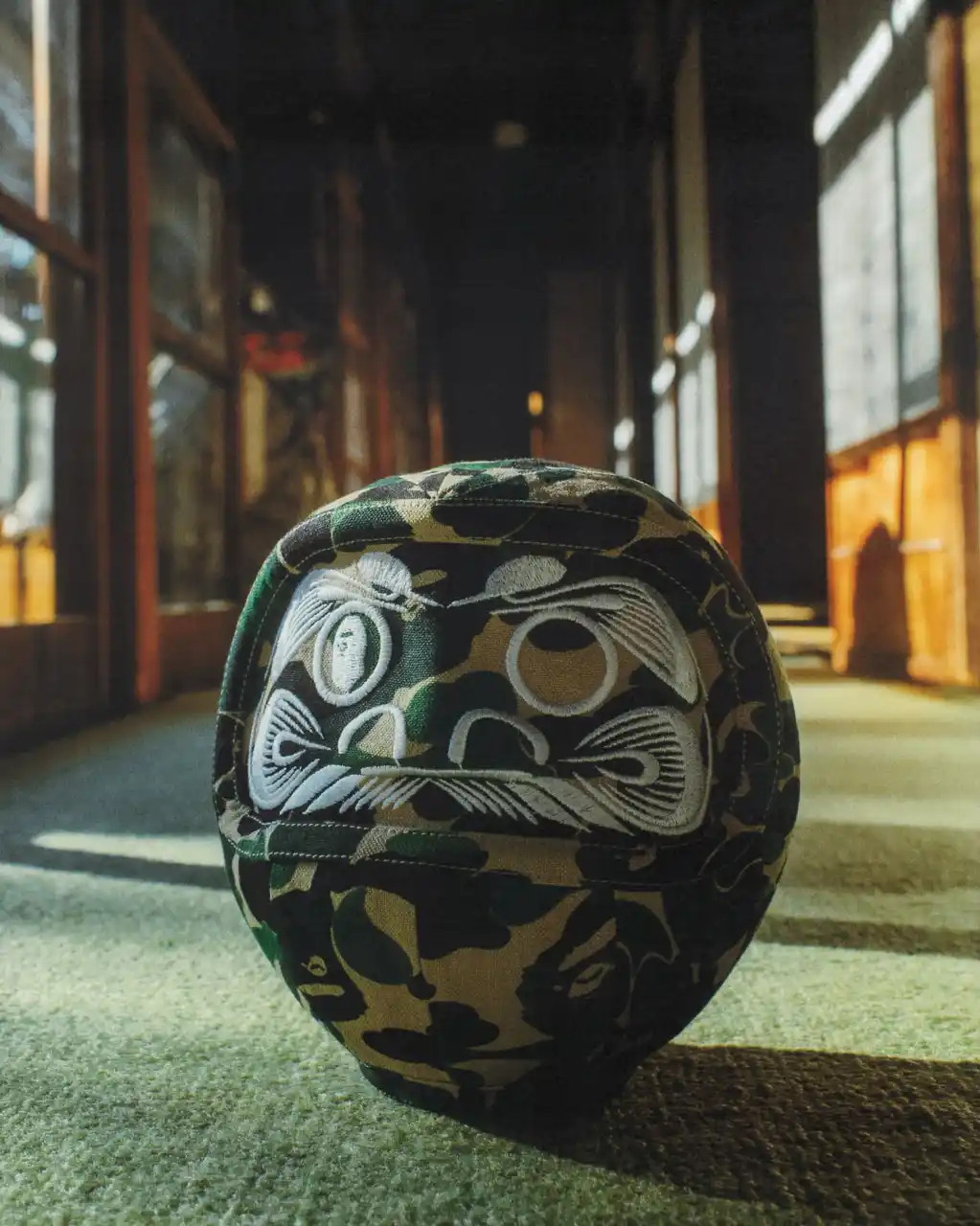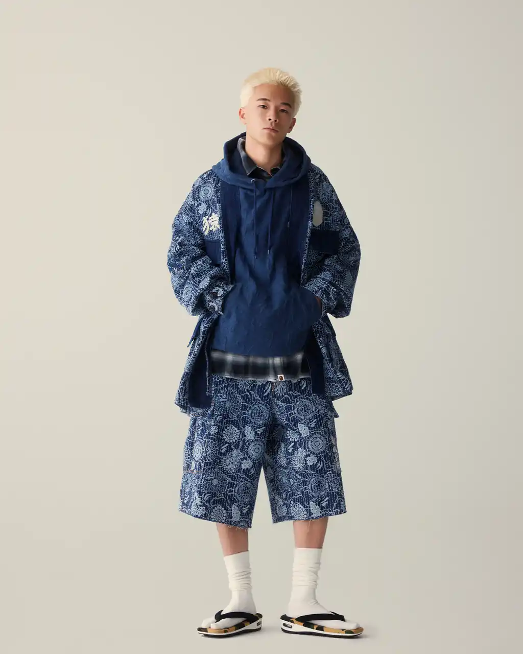 ヴィンテージの日本家屋の中で、BAPE(R)のSS26 ARTピースは周囲の空間と呼応するように存在しています。インディゴの色合いは時を重ねた畳の風合いを思わせ、グラフィックの大胆な表現は、無垢の木材や障子の静かな佇まいと鮮やかなコントラストを描き出します。 |