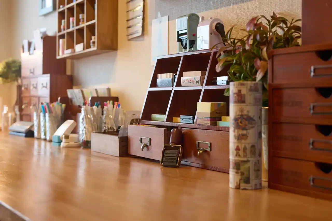手帳を彩るアイテムが使い放題 何十本ものペン、色鉛筆、マスキングテープ、スタンプなど、手帳関連の文房具をすべてその場で自由にお使いいただけます。 |