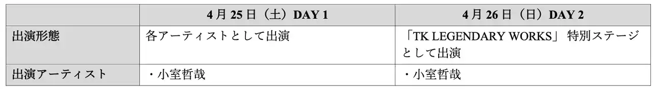 (土)は小室哲哉氏、OVAL SISTEM、365°がそれぞれ出演し、26 日(日)は小室哲哉氏プロデュースの特別ステージ「TK LEGENDARY WORKS」として出演いたします。 |