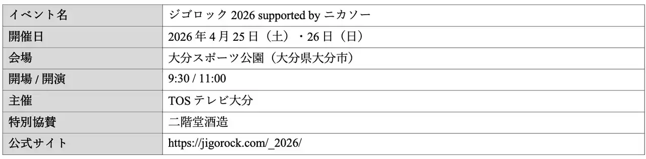 THE WHY HOW DO COMPANY 株式会社(本社:東京都新宿区、代表取締役社長:亀田信吾、証券コード:3823、以下「当社」)は、当社子会社 Pavilions 株式会社および株式会社 SOUND PORT の代表取締役である小室哲哉氏が「TK LEGENDARY WORKS」として、また小室哲哉氏プロデュースの音楽ユニット「OVAL SISTEM」および「365°」が、大型野外音楽フェス「ジゴロック 2026 supported by ニカソー」(主催:TOS テレビ大分、以下「本イベント」)に出演することをお知らせいたします。 |