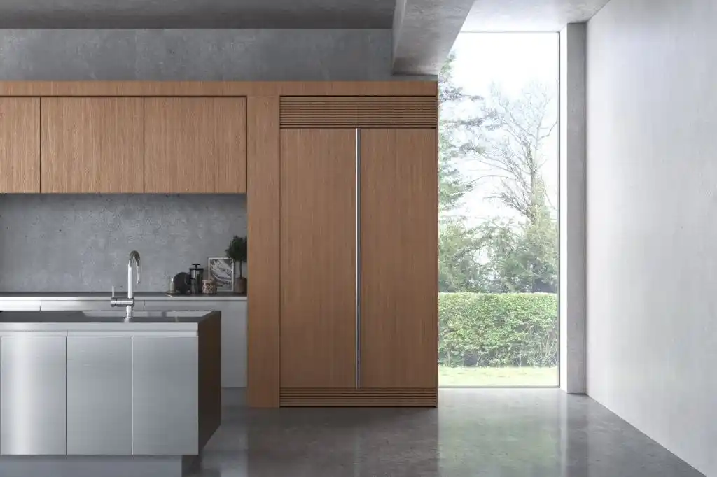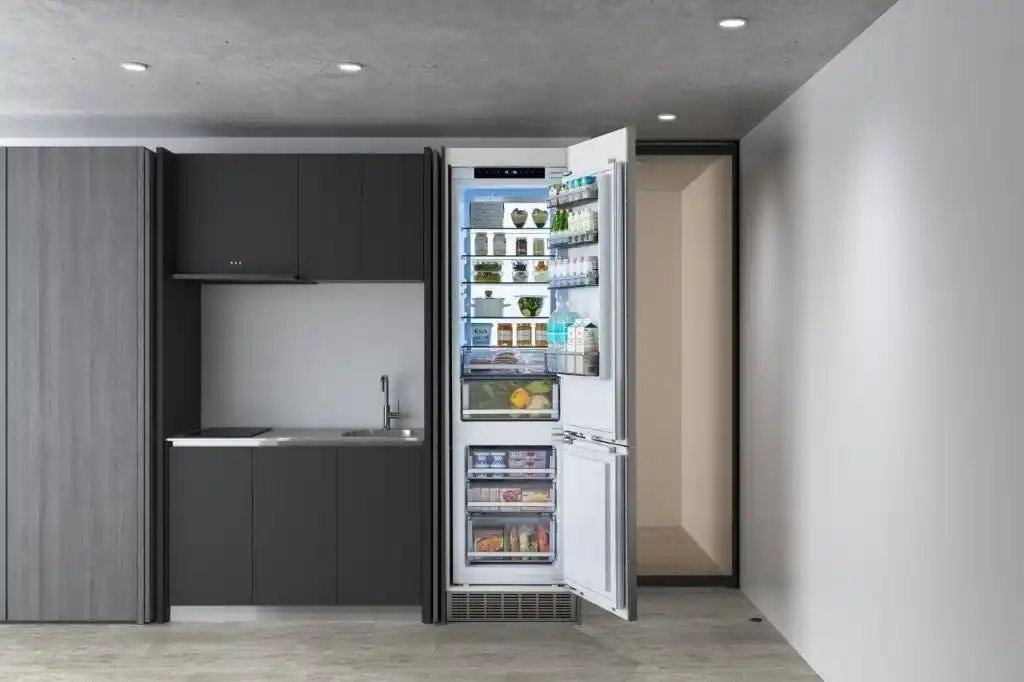 本製品はビルトイン冷蔵庫本体のみを提供する仕様としており、冷蔵庫扉を含む外側の面材(仕上げ材)は付属しておりません。外装デザインはすべて設置現場でご選定いただく形式のため、キッチン空間のテイストや設計コンセプトに合わせた最適な造作が可能です。2026年秋以降には、当社オリジナルのキッチン収納にビルトインできるモデルの展開を予定しており、冷蔵庫そのものを家具と一体化させたより高度な空間設計が可能になります。 |