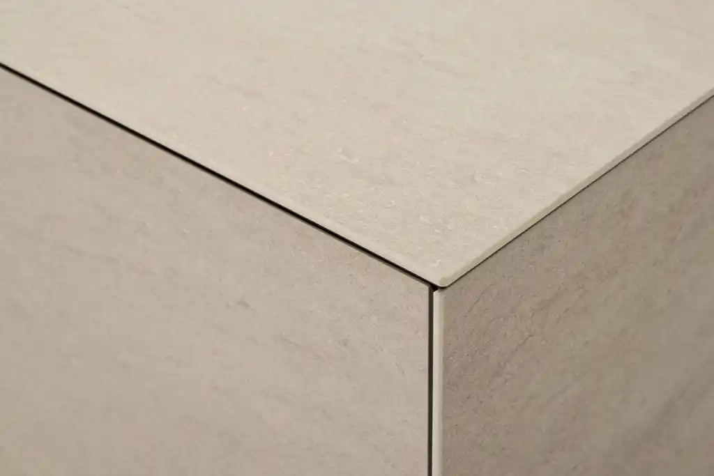 薄いセラミック素材の特性を最大限に活かし、天板や扉の小口を、極限まで目立たないシャープな仕上げにしました。余分な線や凹凸を排除することで、空間全体のトータルデザインを邪魔しない、ノイズレスな一体感を追求しました |