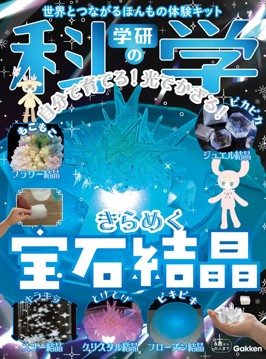 | 『学研の科学』は、体験キットの「きらめく宝石結晶」、さまざまな結晶の不思議を紹介している本誌、別冊の学研まんが「ひみつシリーズ」、実験の投稿やオンラインワークショップに参加できるオンラインコミュニティ「あそぶんだ研究所」がセットになって、ほんものの科学体験をお届けします。 | ||||||||