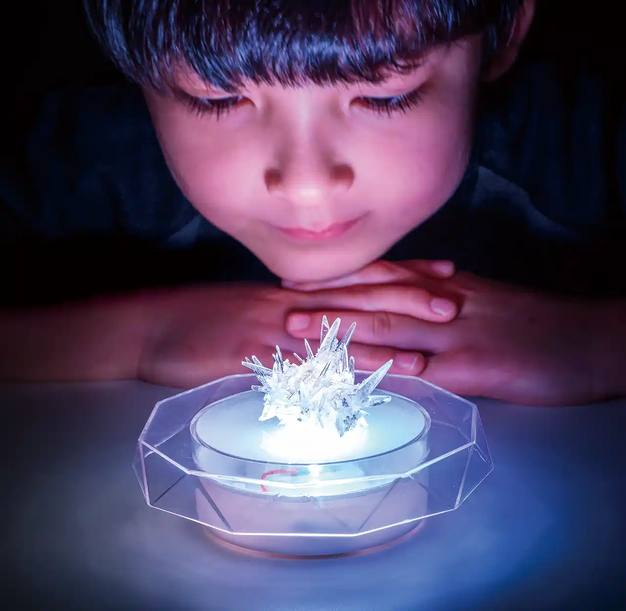 | 『学研の科学』で初めての化学実験教材。5種類の薬品と実験器具つきで、それぞれちがう形の結晶が育てられます。結晶の育つ期間はいろいろ。結晶を虹色にライトアップするLED台座もついています。 |