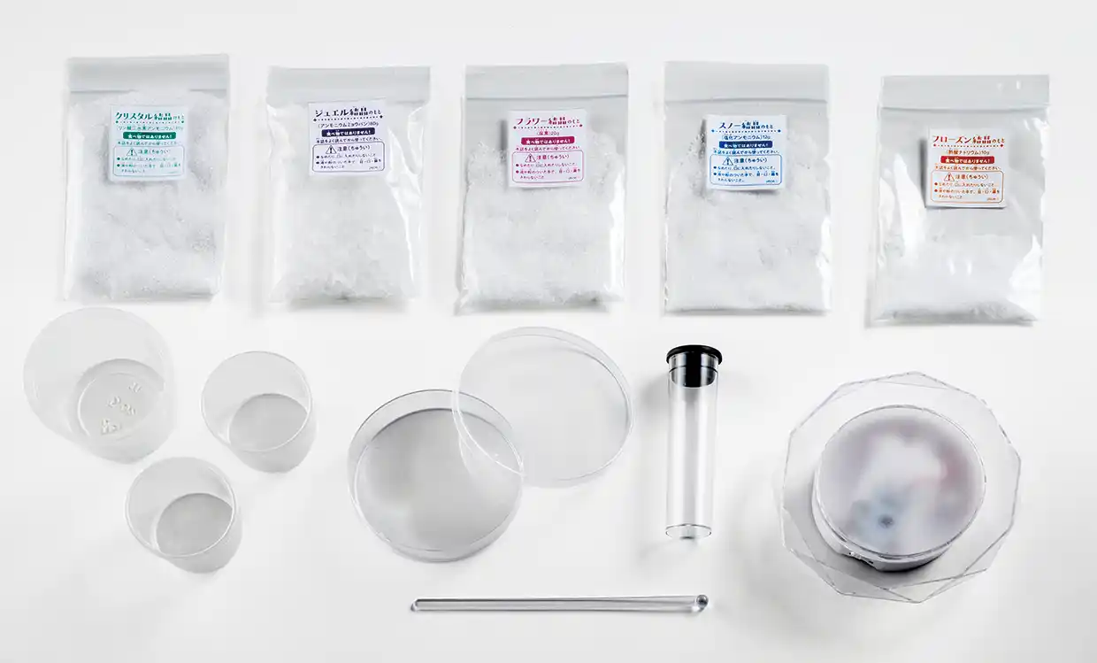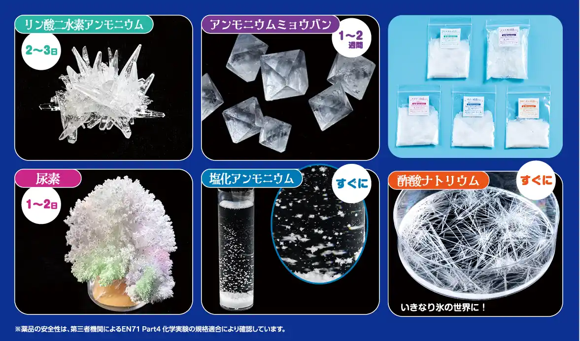 | ●クリスタル結晶(リン酸二水素アンモニウム) ●ジュエル結晶(アンモニウムミョウバン) ●フラワー結晶(尿素) ●スノー結晶(塩化アンモニウム) ●フローズン結晶(酢酸ナトリウム) | ||||||||