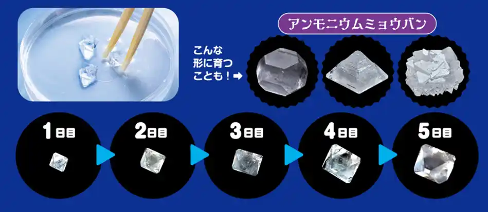 | 「結晶のもと」が5種類もついていて、それぞれちがう形の結晶が育てられます。育つ期間はいろいろ。すぐできる結晶や、2~3日で育つ結晶、1~2週間楽しく育てる結晶もあります。 | ||||||||