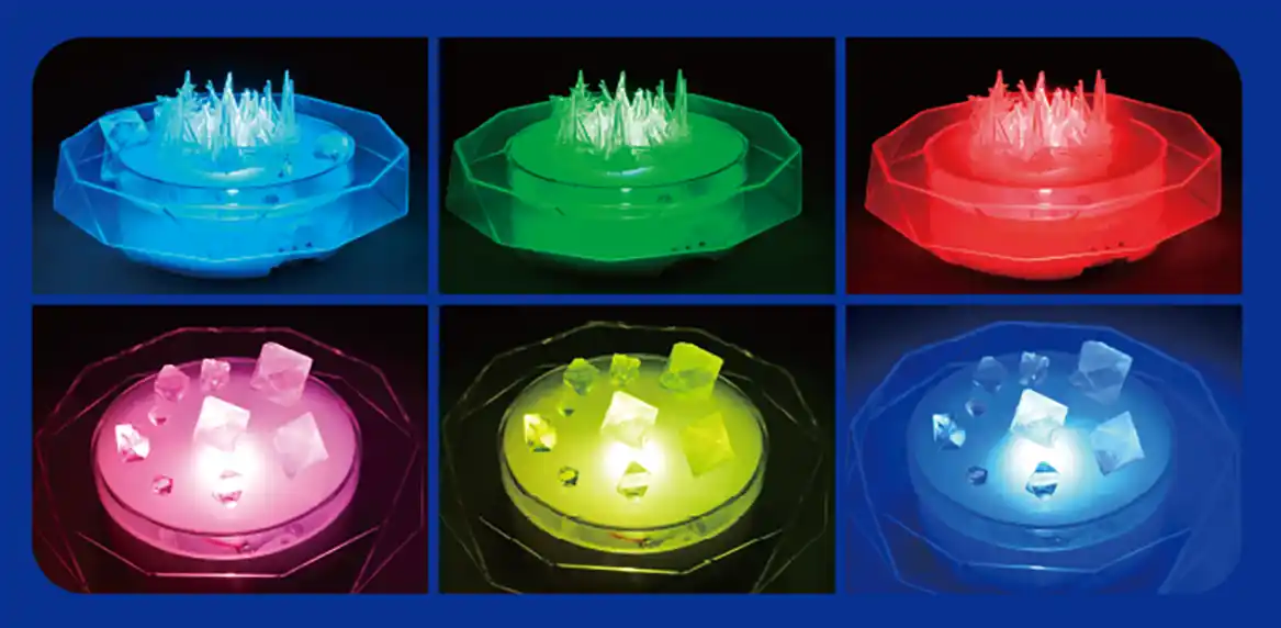 | 結晶を美しくライトアップするイルミネーションステージ(LED台座)がついています。成長する過程や完成した結晶を置いて、じっくり観察できます。育てた結晶が虹色に変化してキレイ! | ||||||||