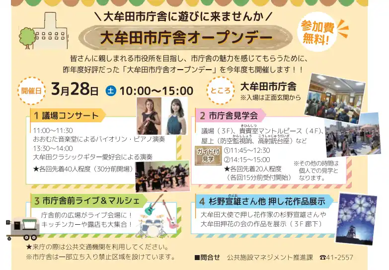 | 議場コンサートをはじめ、市庁舎見学会など様々な企画があり、キッチンカーや露店も出店します。 | |||||||||