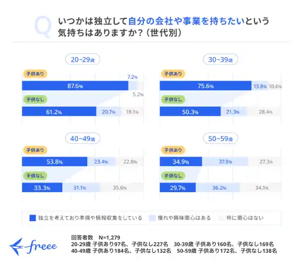 freeeが実施した「2026年のキャリアに関する意識調査」において、20~50代の会社員に「いつかは独立して自分の会社や事業を持ちたいという気持ちはありますか」と尋ねたところ、20代・30代・40代・50代の全ての年代で、子どもがいる層が子どもがいない層よりも起業・独立意欲が高いという結果が明らかになりました。 |