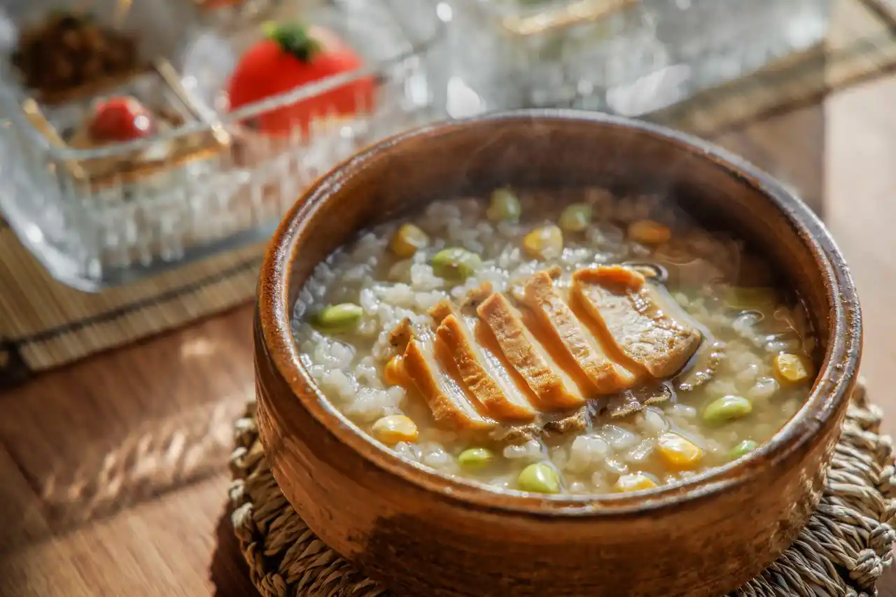 | 特徴2 野菜出汁と鮑出汁で仕立てた朝粥 | |||||||