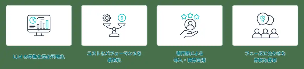本サービスは、生成 AI 活用の課題である「回答精度の不安定さ(ハルシネーション等)」や「不透明なコスト」をリアルタイムで監視・分析できる環境を構築し、企業の生成 AI 活用における成果の最大化と安定運用を支援します。 |