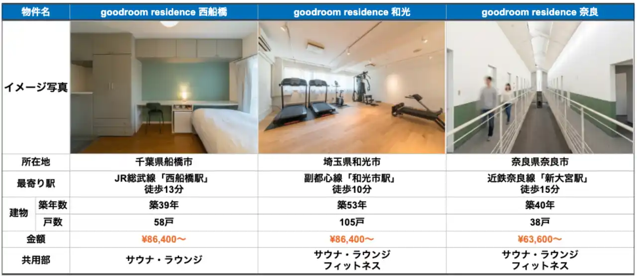 | 今回開業する3物件は、千葉県船橋市、埼玉県和光市、奈良県奈良市に位置し、昨年まで竹中工務店の社員寮として利用されていましたが、従業員の住まいに対する価値観の多様化を背景に、当該3物件の寮運用が停止されました。居室に水回りがないドミトリータイプであり、地方都市の物件は賃貸市場での安定的なニーズ確保や運営の難易度が高いという課題がありました。そこで、バリューアップにより古いストックの利活用に取り組んできたグッドルームが設計・施工・運営ノウハウを活かして一気通貫で企画を行い、「goodroom residence」として再生いたしました。 | |||||||||