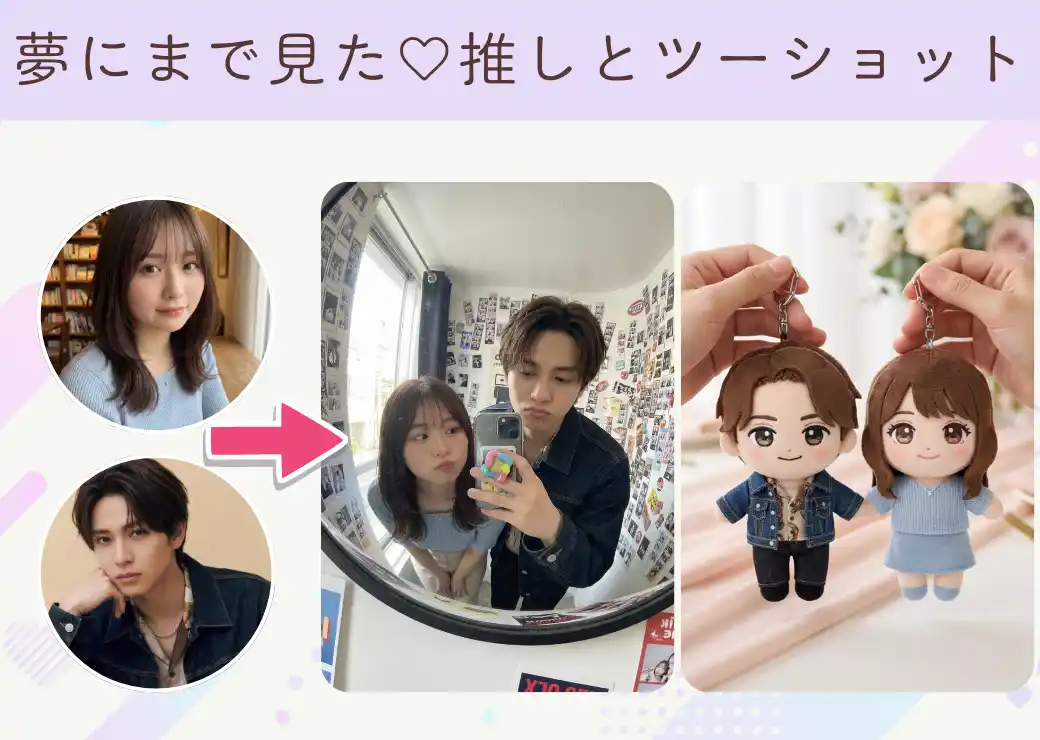 YouCamのAI生成機能を活用すれば、推しと自分の写真を組み合わせたツーショット画像の生成も可能です。 まるで一緒に撮影したかのような記念写真や、お出かけ風の一枚など、「推しと写真が撮れたら」というファンの夢をAIが叶えます。 |