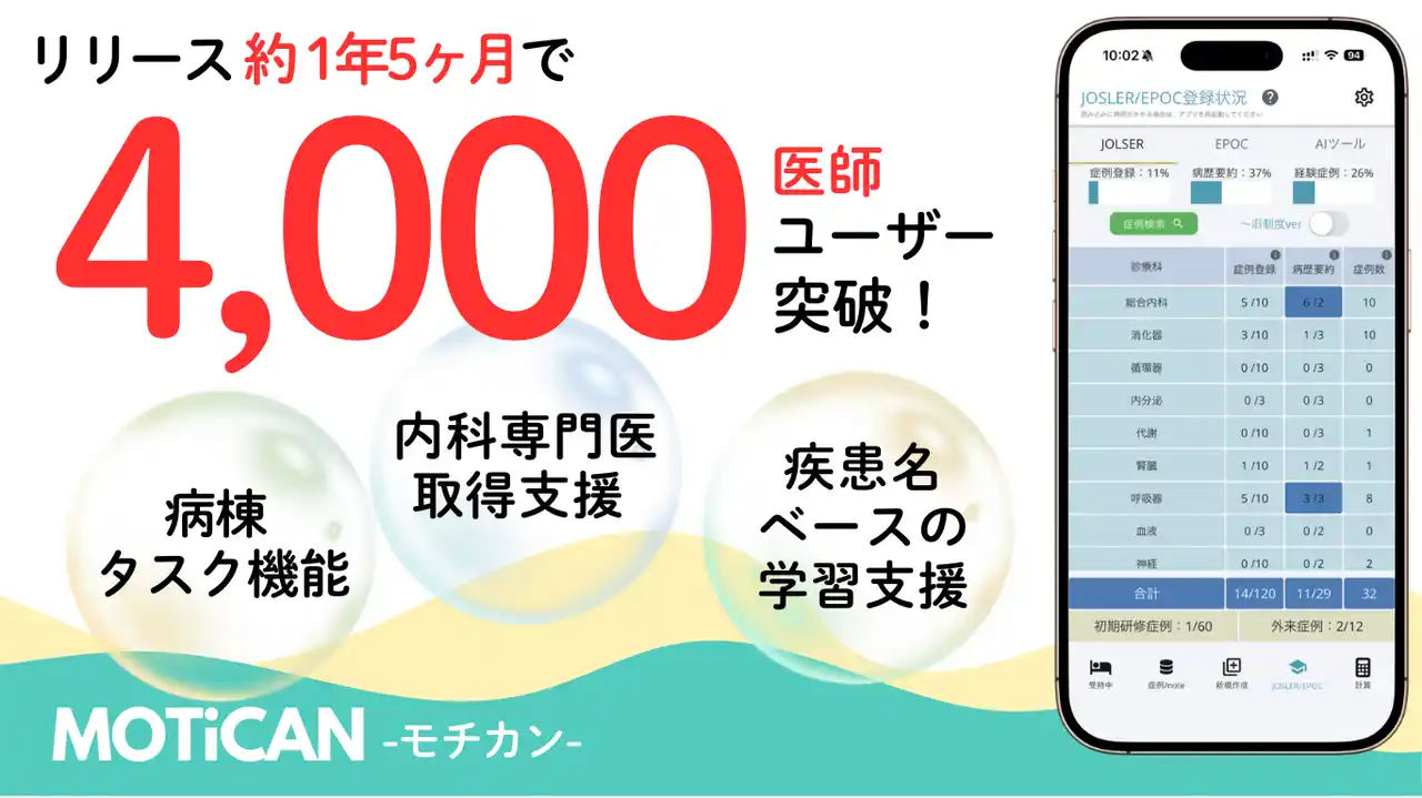 | 「医師にしかわからないペインが、なかなか解決されない。MOTiCANは、その課題を医師自身の手で解決するために生まれたアプリです。4,000人の先生方に日常的にご利用いただいていることは、我々のアプローチが現場の課題を捉えている証だと感じています。今後はJ-OSLER支援をさらに深化させ、内科専門医を目指すすべての医師にとって、最も頼れるパートナーとなれるよう開発を続けてまいります。」 | |||
