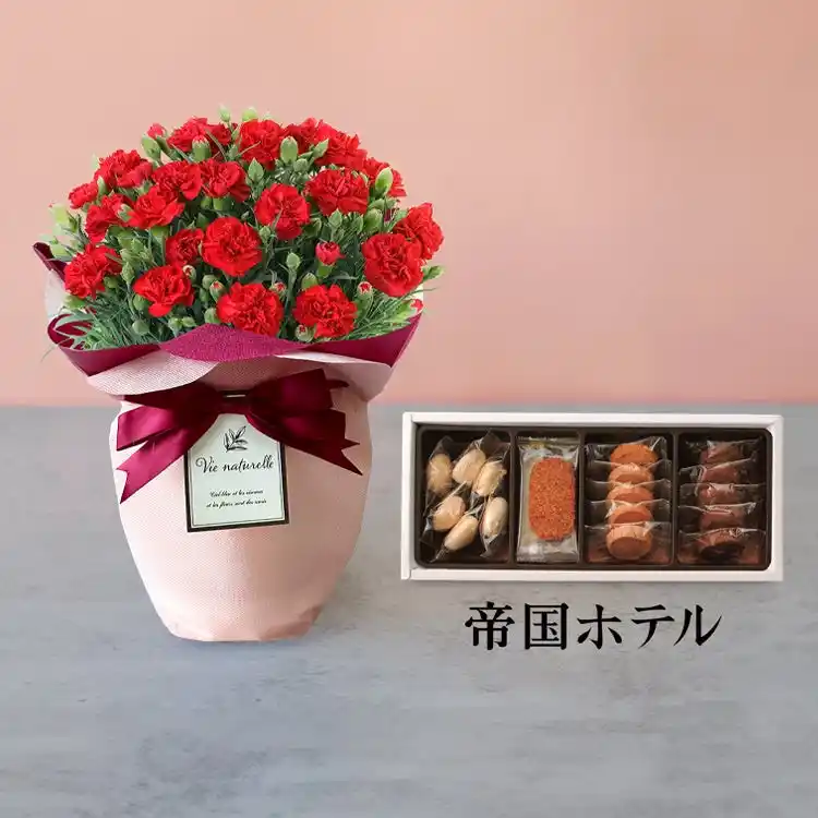 母の日の象徴ともいえる赤いカーネーションの鉢植えと<帝国ホテル>で人気のクッキー詰合せのセットです。育てやすい鉢植えは、可愛らしいラッピングでより一層喜ばれる人気のアイテム。 |