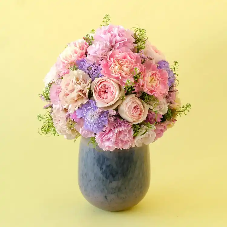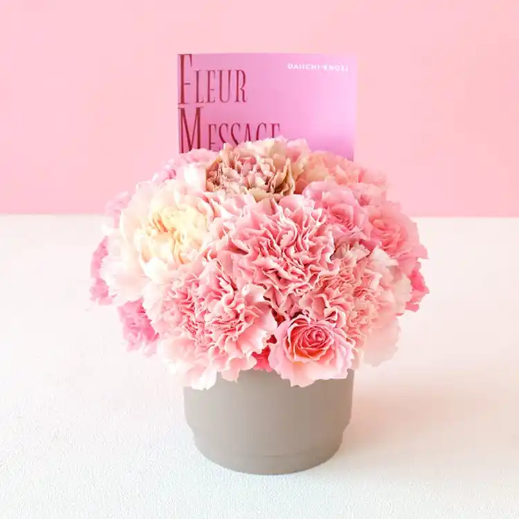 やさしいピンク色は、幅広い世代に人気の定番カラーです。淡いピンクが重なる、ふんわりとした表情のアレンジメントに仕上げました。器付きでそのまま飾れます。 |