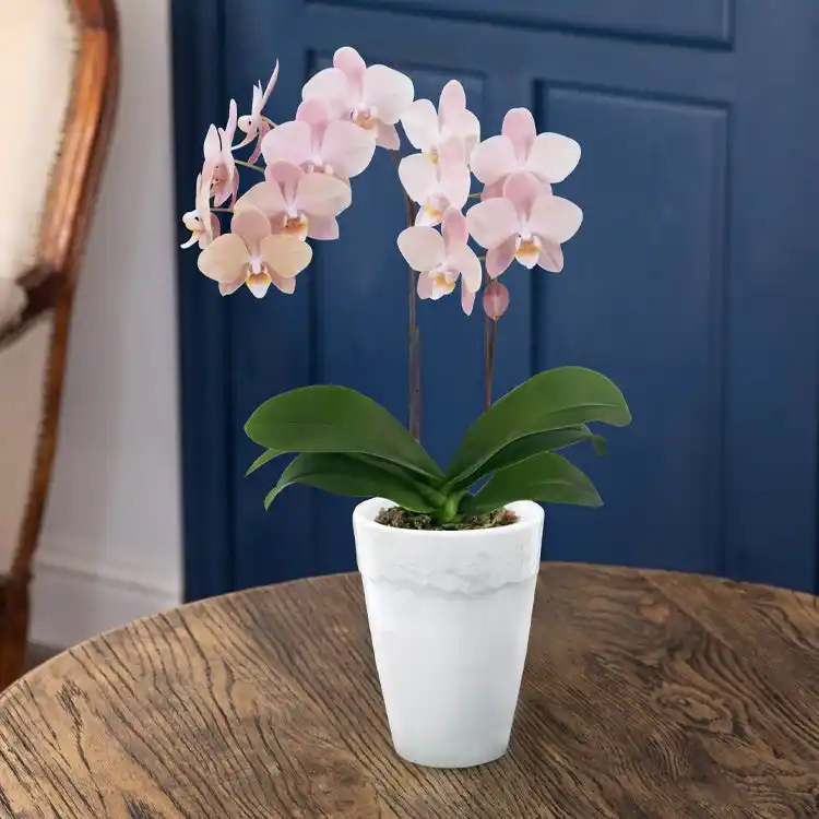 ふんわりと頬を染めたようなピンクベージュが美しい胡蝶蘭。 |