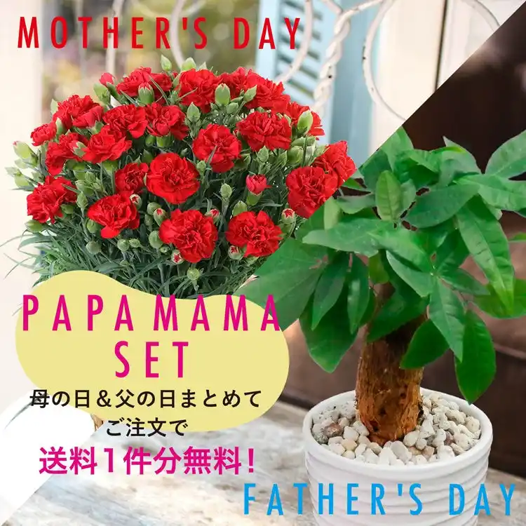 母の日には定番の赤いカーネーションの鉢植えを、父の日には育てやすい観葉植物・パキラの白陶器鉢植えを贈るお得なセットです。 |