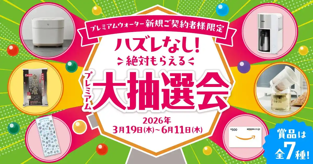 良質な水を育む日本有数の水源地から採取した天然水を、おいしさもミネラル分もそのままに保つ非加熱処理を施しご家庭に提供しているプレミアムウォーター株式会社(所在地:東京都渋谷区、代表取締役社長:金本 彰彦)は、『ハズレなし!絶対もらえるプレミアム大抽選会』を2026年3月19日(木)から開始いたします。 |