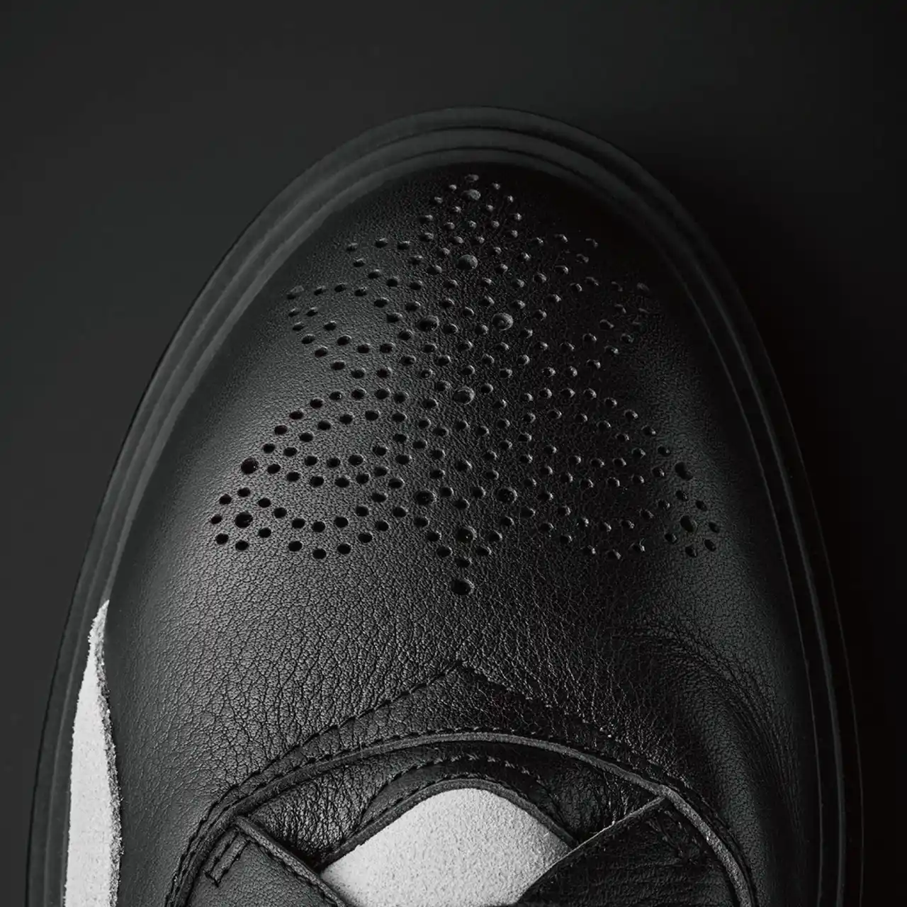 革靴の装飾として知られるメダリオンは、本来、湿気や水分を逃がすための通気孔としてアウトドアシューズに用いられていた要素。FIYADはその起源を現代のスニーカーに再解釈して落とし込むことで、装飾性と機能性を両立させている。 |